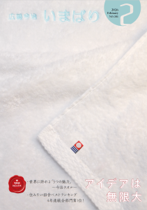 今月の表紙 今治タオル本店・今治タオルLAB(テクスポート今治)で、真っ白でふわふわな今治タオルに広報紙のタイトルを刺繍していただきました。 ここでは多数の今治タオルブランド商品を買うことができ、刺繍を入れることもできます。 ブランドが始動してもうすぐ20周年。その圧倒的な知名度で、さらに展開を進めていきます。
